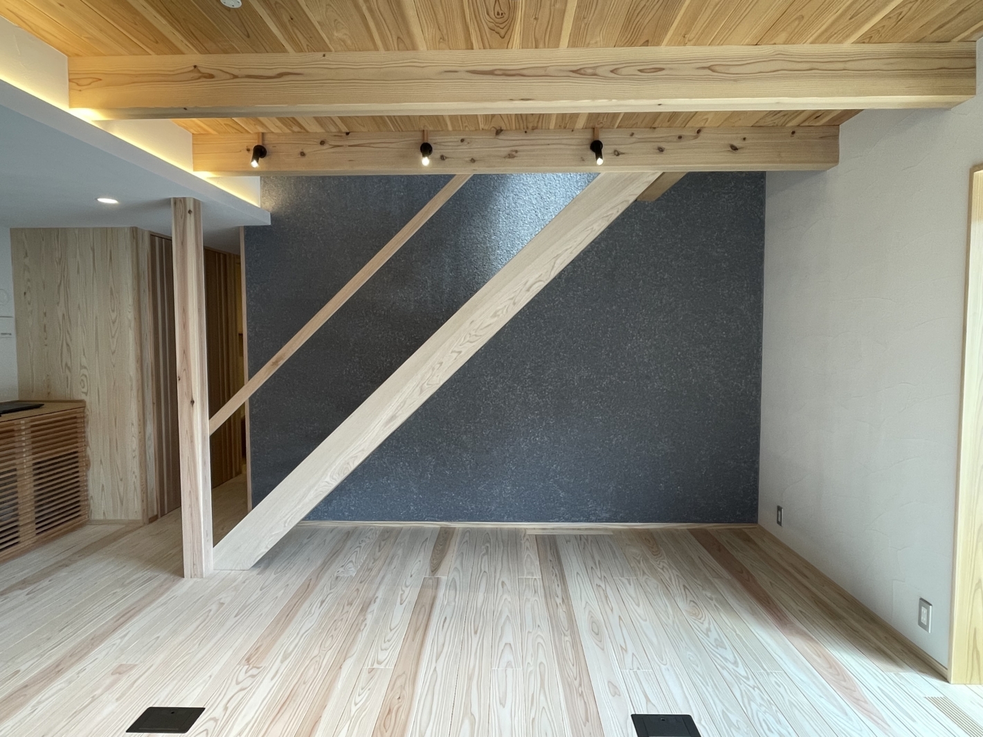 1Fの壁には、普段外壁で使用している「そとん壁」をあえて室内にも採用しています。本来は雨や風から建物を守るための素材ですが、土壁のような荒い質感は、無垢の床や構造材とも相性がよく、落ち着きのある空間に仕上げています。