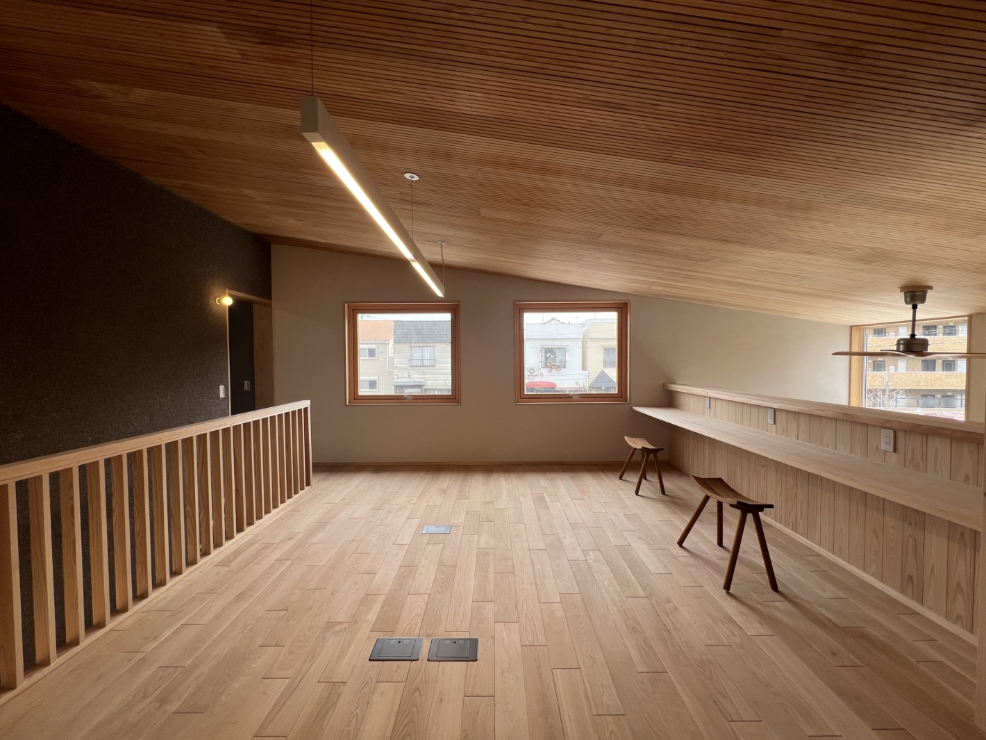 モデルハウスと事務所を兼ねているため、2階はスタッフの仕事場と打ち合わせスペースになります。現在は引っ越し前のためデスクなどはまだ入っていませんが、これからこの場所で新しい家づくりが始まります。