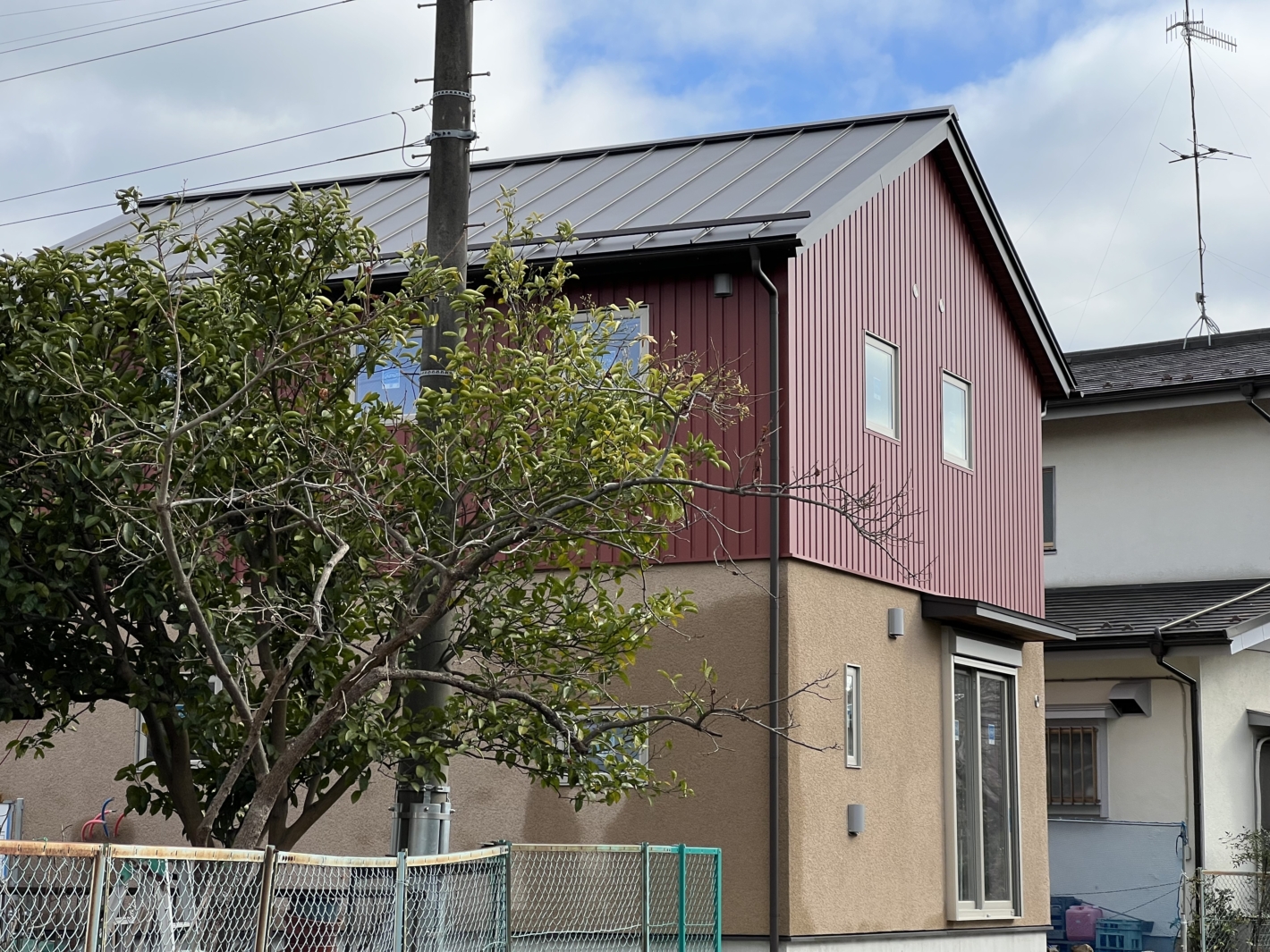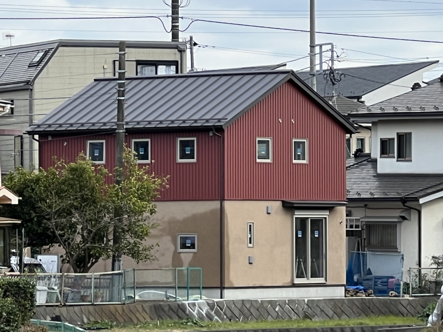 外観は2階部分が赤いガルバリウム鋼板、1階部分はベージュのそとん壁。ツートンカラーの個性的だけど親しみを持てる可愛らしいおうちです。